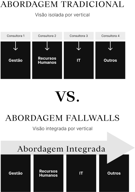 O mercado tradicional adota uma abordagem vertical, com intervenções isoladas e focadas em áreas específicas. Nós, por outro lado, adotamos uma abordagem horizontal, onde trabalhamos todas as áreas de forma integrada.