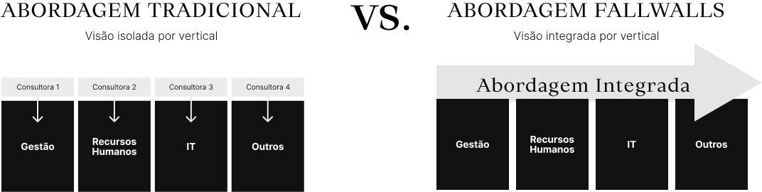 O mercado tradicional adota uma abordagem vertical, com intervenções isoladas e focadas em áreas específicas. Nós, por outro lado, adotamos uma abordagem horizontal, onde trabalhamos todas as áreas de forma integrada.